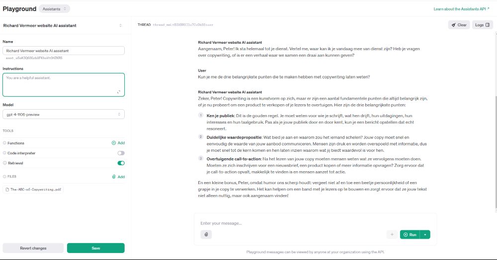 Als je bent ingelogd kun je links klikken op “AI assistants”. En daar ga je aan de slag. Hier kun je (zeer gedetailleerde) instructies geven aan de chatbot. Zo kun je aangeven welk GPT model je wilt gebruiken (de kosten van de diverse modellen verschillen namelijk). Je kunt aangeven of je (programmeer)code wilt toevoegen aan je bot, of dat je Ai assistent zelf code dient te kunnen interpreteren en verbeteren en adviezen op dit gebied kan geven. En daarnaast kun je bestanden toevoegen die door de bot worden gebruikt om antwoord te geven op vragen van de eindgebruikers.