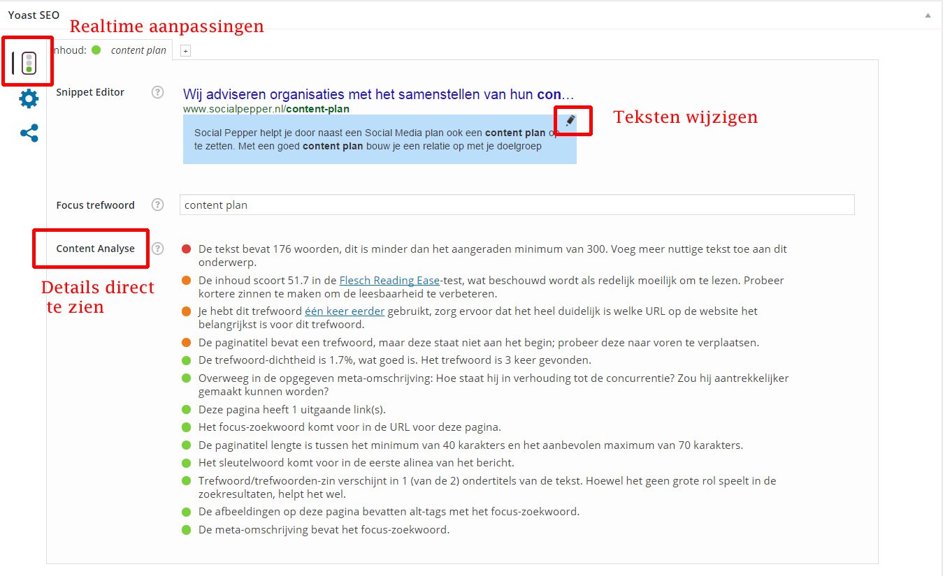 Met deze versie van de plugin is het mogelijk om direct te zien wat het resultaat is van de wijziging die je doorvoert. De kleuren van het stoplicht geven aan of dat je goed bezig bent. Rood: Er is zeker nog veel ruimte om te optimaliseren. Groen: Optimalisering is okee, de contentanalyse geeft de details om verder te optimaliseren. Bekijk de tekstanalyse (die allemaal hun eigen ‘stoplicht’ kleur hebben), voor de diverse details waarop de plugin adviseert.